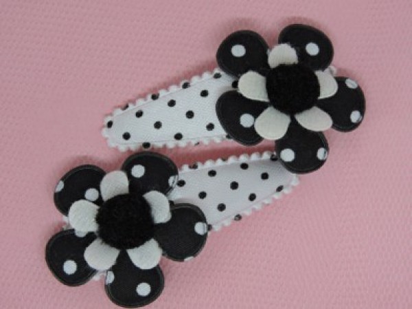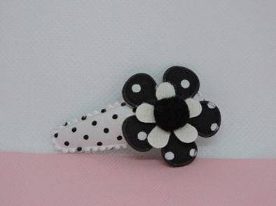 Haarspeldje wit met zwarte stippen. Er zit een bloem op en een pompon